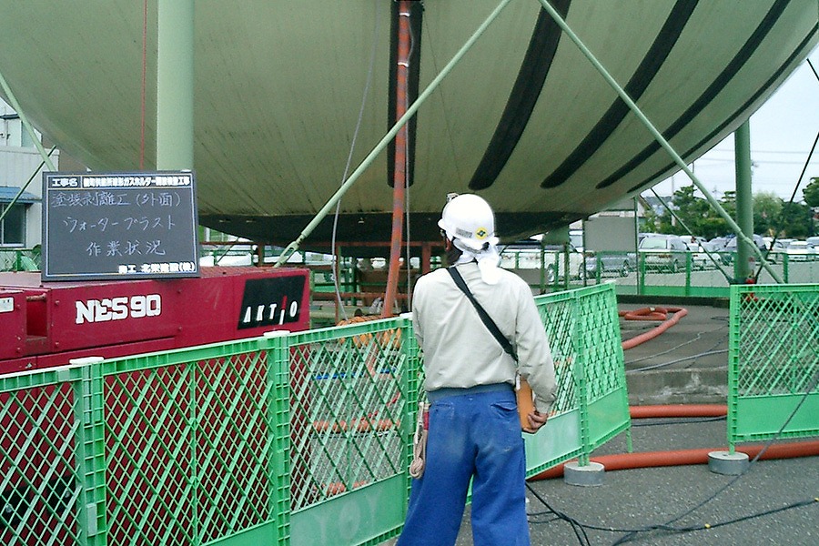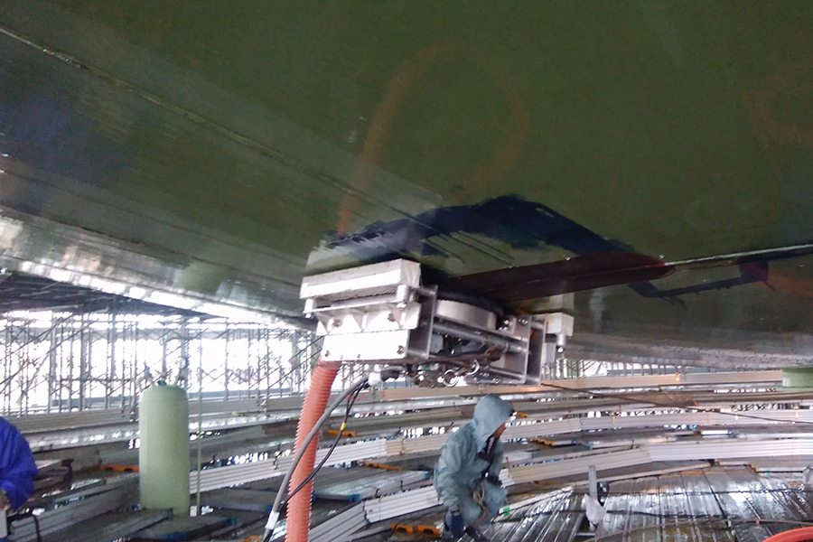 遠隔操作の自走式ロボットが塗装を剥離し、水と剥離片を共に回収します。ロボット・バキューム装置・超高圧ポンプを使用する事で、吸着したまま遠隔操作で走行し、効率よく塗装面や汚れを剥離させながら、水と剥離片を廃水処理装置が自動で分別し、作業を行う事が可能です。そのため、安全かつ省力化が実現します。